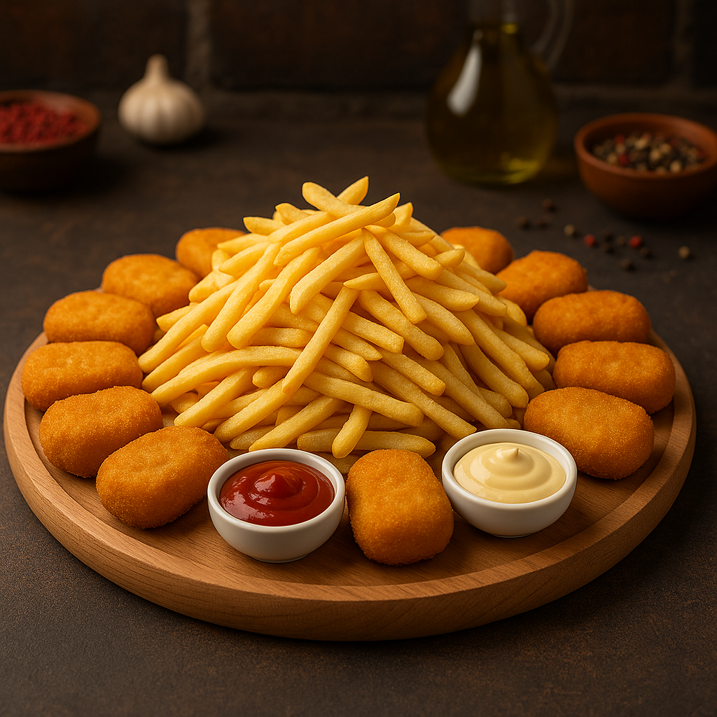 Veliku tacnu sa 700 g hrskavog pomfrita, 20 pilećih nuggetsa, kao i 4 različita umaka (majonez, kečap, slatko-kiseli). Idealan izbor za dečiji rođendan ili porodično slavlje.
