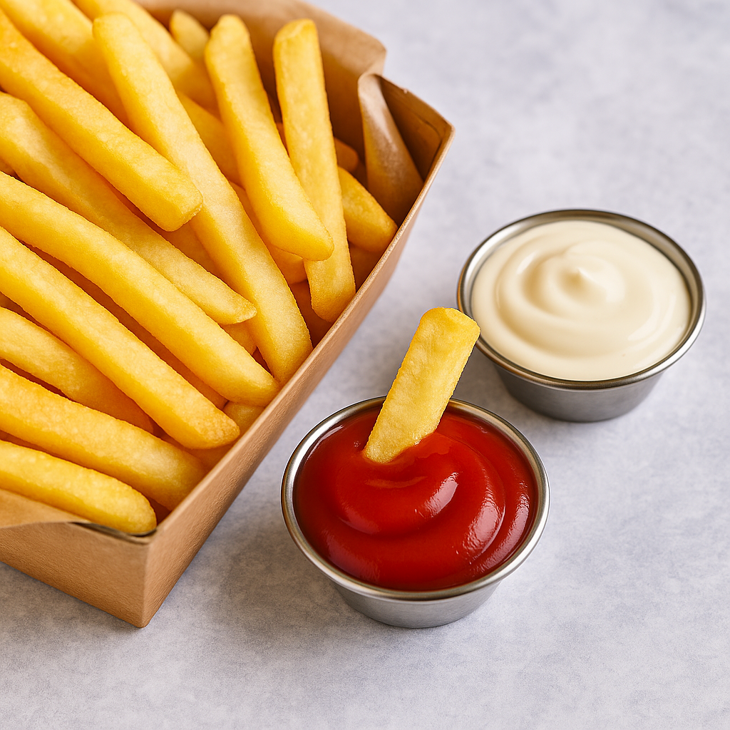 Velika tacna 1 KG hrskavog pomfrita, kao i 4 različita umaka (majonez, kečap). Idealan izbor za dečiji rođendan ili porodično slavlje.